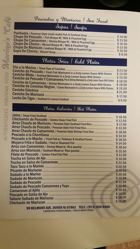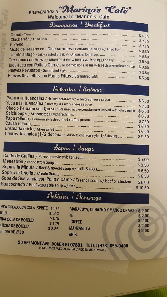 Welcome to Marino's Cafe, a gem nestled in Dover, NJ, specializing in authentic Peruvian cuisine. The menu artfully showcases traditional flavors, featuring starters like Papa a la Huancaina and Fried Yucca drizzled with creamy cheese sauce. Dive into hearty soups such as the rich Sancochado or the flavorful Seafood Bisque for a taste of Peru’s coastal delights.